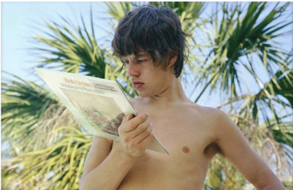 On a break during their third U.S. tour, The Rolling Stones took a breather at the Manger Towne and Country Motor Lodge in Savannah, Georgia, en route to their next show in Clearwater, Florida. Poolside under the palms, Mick Jagger was photographed in a candid moment, reading the back cover of Bob Dylan’s just-released Bringing It All Back Home, a bold, electric turn from Dylan’s folk protest roots.
