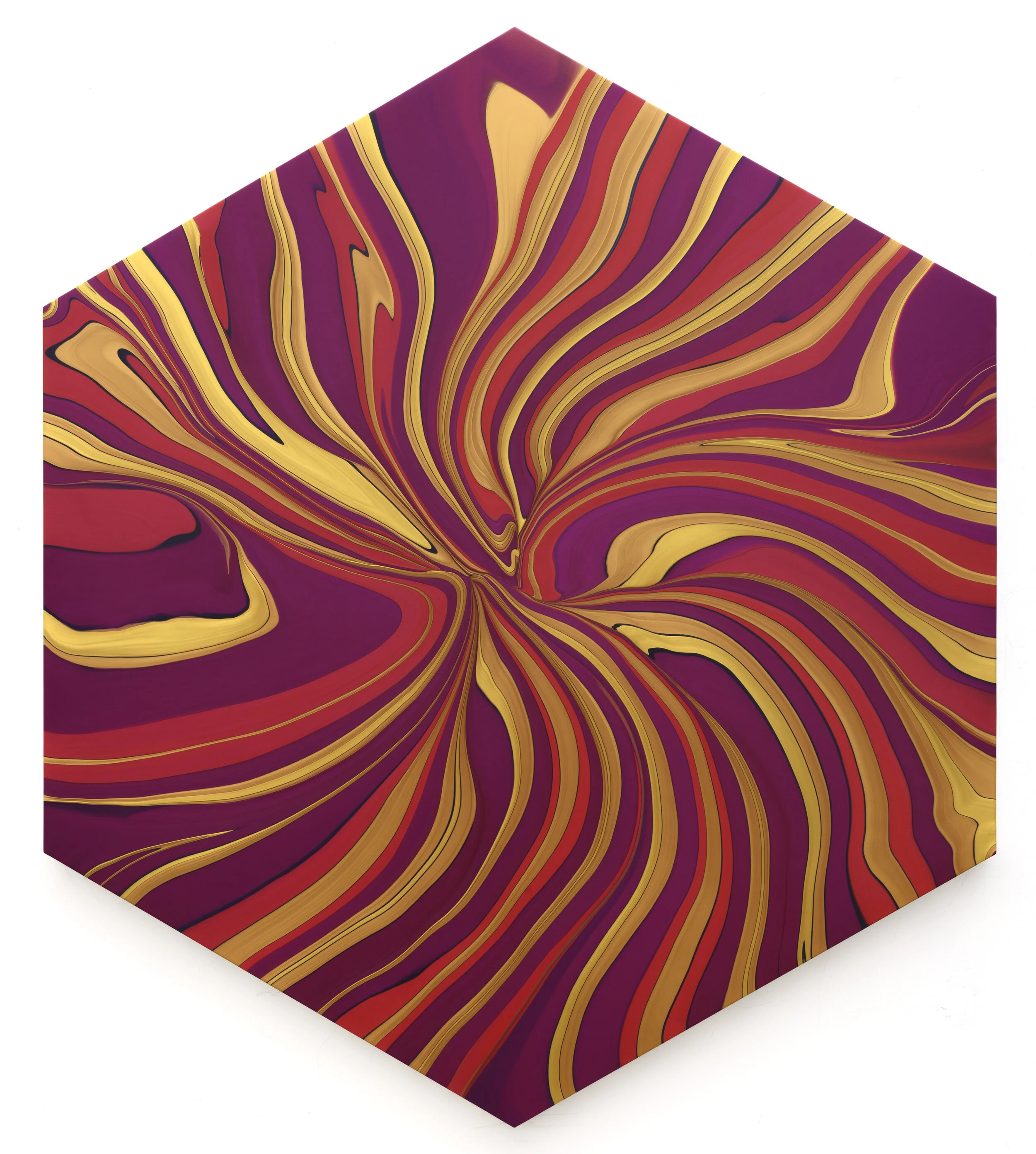 The images reveal undeniable traces of natural phenomena, seeking not to replicate the natural world, but rather to suggest the forces of nature itself. His complex process of mixing and pouring paints conveys a sense of undulating energies pushing and pulling within the rectilinear, circular and hexagonal forms of the canvases themselves.